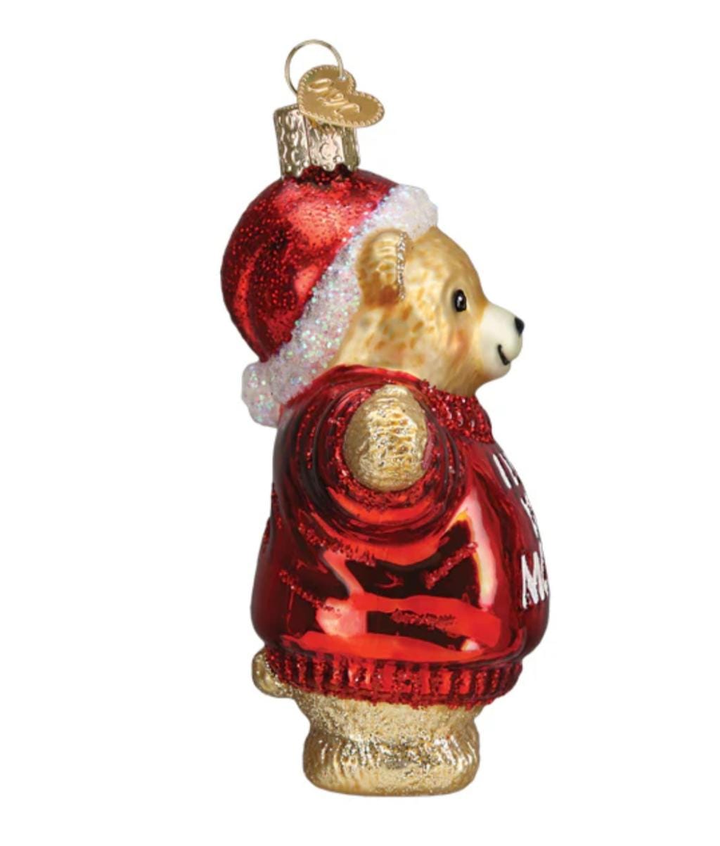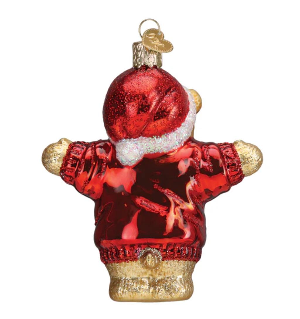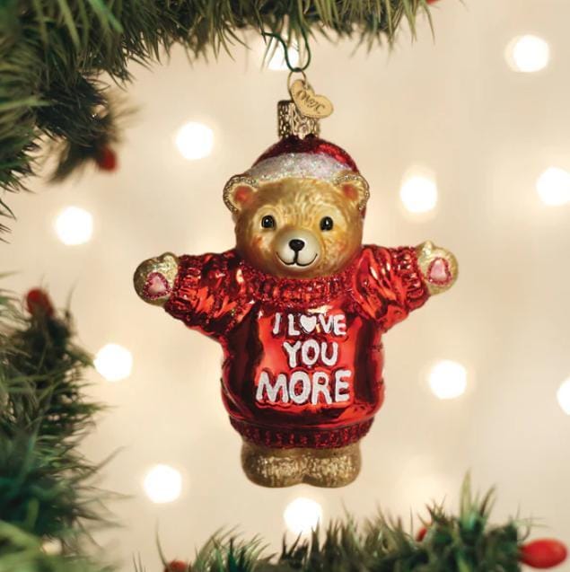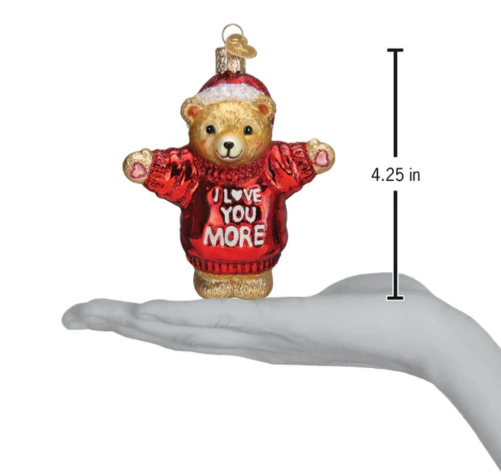 Stel je voor: een knusse kerstavond, twinkelende lichtjes en onder de boom hangt deze betoverende kerstbal. De beer in zijn rode trui met hartjes is een tijdloos symbool van liefde. Het is net alsof hij fluistert: "I love you more". Een perfect cadeau voor je geliefde om te laten zien hoeveel je om hem of haar geeft. Deze handgemaakte kerstbal van Old World Christmas is een schat die je jaar na jaar weer tevoorschijn kunt halen.