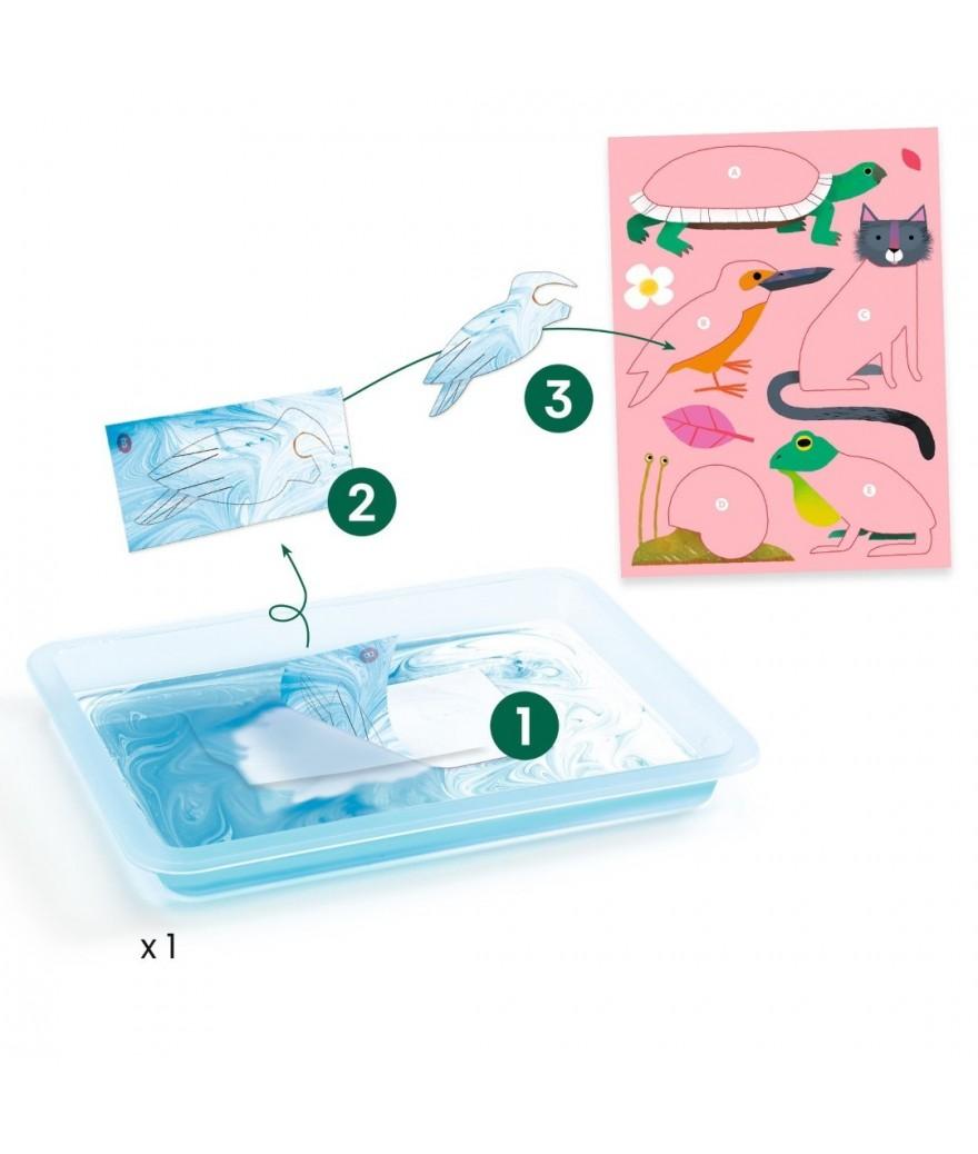 - Inhoud: 4 geïllustreerde schilderijtjes (21 x 28 cm), 44 stickers om "af te drukken", 1 plastic bakje, 5 flesjes gekleurde inkt (groen, oranje, zwart, blauw, bruin) + 1 transparante, 4 zakjes poeder voor de bereiding van het bad, 6 stokjes, 1 boekje met stap-voor-stap uitleg in kleur.
