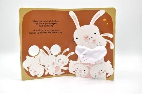 Een knuffelbaar konijntje op de cover, waarmee kinderen kunnen knuffelen tijdens het lezen.
