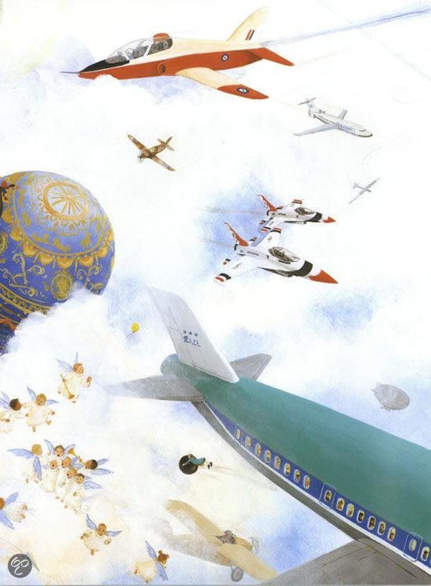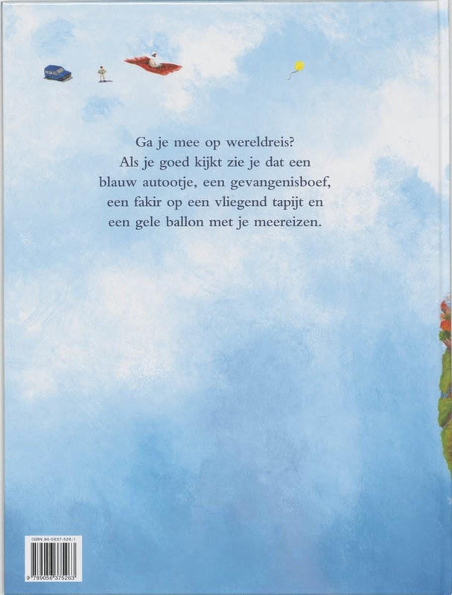 Dit schitterende prentenboek van Charlotte Dematons heeft geen tekst en een verhaal lijkt te ontbreken. Maar de goede kijker ontdekt al snel dat de verschillende platen van de stad, de woestijn, het oerwoud en de zee iets met elkaar te maken hebben. Telkens opnieuw duikt er een blauw autootje op, een fakir op een vliegend tapijtje, een boef in gevangenistenue, en een gele ballon.