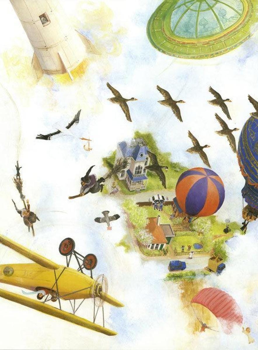 In De gele ballon toont Charlotte Dematons zich niet alleen een meesteres in het scheppen van sfeer ' zij heeft in dit boek ook talloze kleine grapjes verwerkt. Niels Holgersson, de Baron von Münchhausen, Pippi Langkous, Toetanchamon, de kerstman, Repelsteeltje en vele andere bekende figuren uit de (kinder)literatuur wandelen vrolijk over de pagina's en maken dit prentenboek een feest van herkenning. Om eindeloos te bekijken!