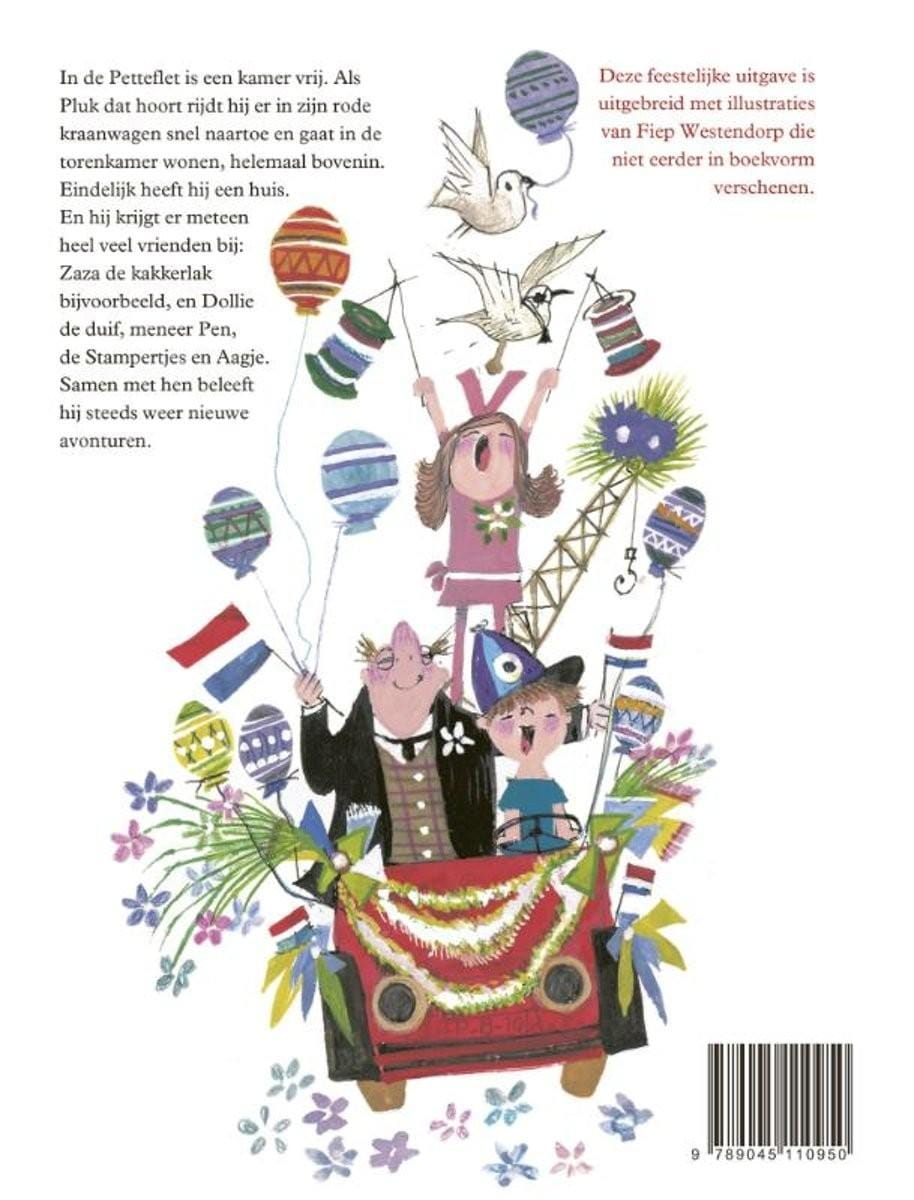 Pluk had een klein rood kraanwagentje. Hij reed ermee door de hele stad en zocht naar een huis om in te wonen. Af en toe stopte hij. En dan vroeg hij aan de mensen: 'Weet u niet een huis voor me?'
