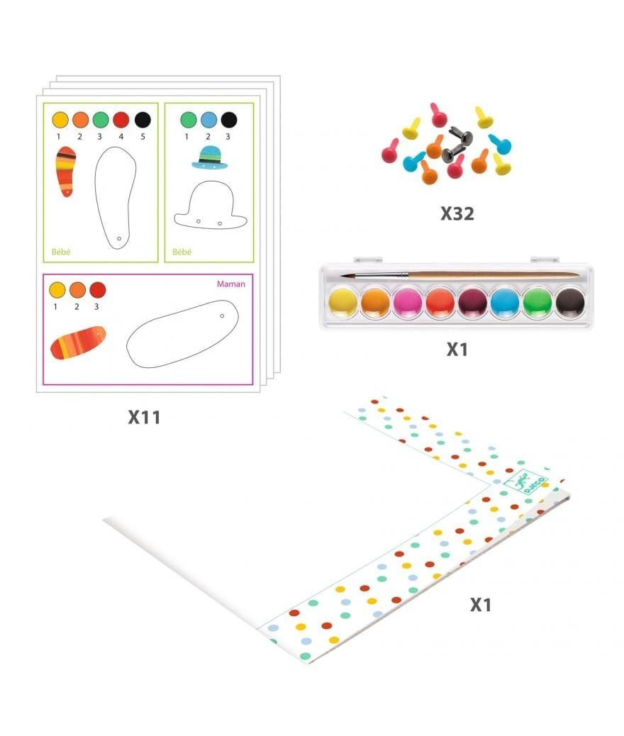 - Inhoud: 12 schildervellen met vormen die loslaten, 1 palet van 8 kleuren plakkaatverf en 1 penseel, 32 splitpennen, 1 beschermend tafelkleed, 1 boekje met stap-voor-stap uitleg.