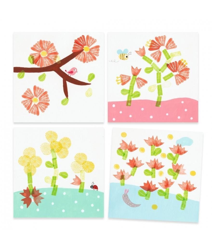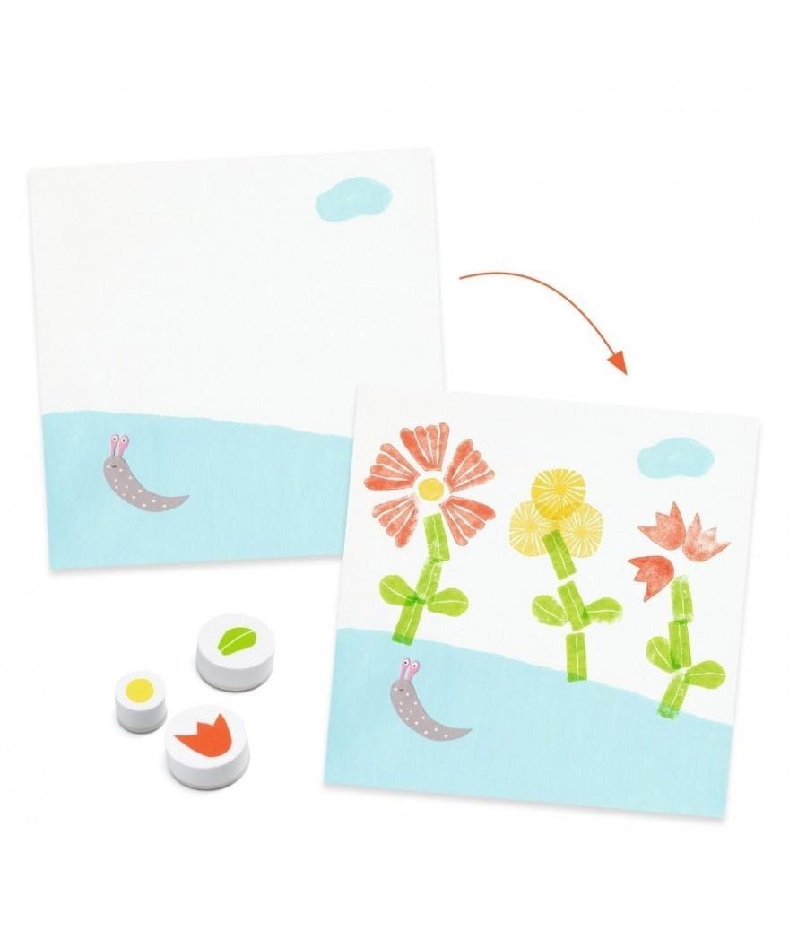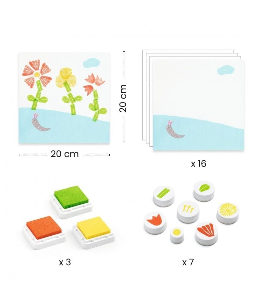 Een doos stempels met als thema bloemen en natuur, waarmee het kind de kaarten met mooie illustraties vrij kan versieren. Stapsgewijs drukt het kind de stempels op de stempelkussens en maakt hij/zij afdrukken om de voorgestelde decors tot leven te brengen. Het kind vindt het leuk om de combinaties te veranderen en kan zijn/haar fantasie de vrije loop laten. Steeds weer anders.