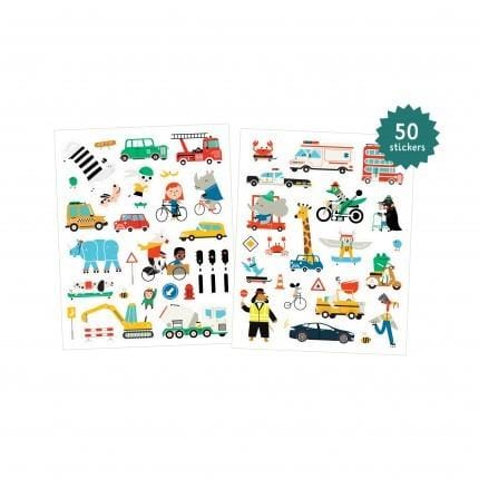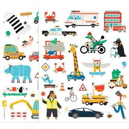 Waar gaan deze dieren heen? Een neushoorn op rolschaatsen, een kikker op een scooter en nog veel meer voertuigen en dieren. Mogen deze leuke beestjes met jou mee onderweg? Plak de stickers op de autoruit en verzin verhalen tijdens de autorit. Misschien, als je goed oplet, spot je buiten ook nog wel een uil op een skateboard.