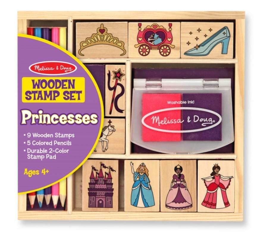 - inhoud: 8 houten stempels en een stempelkussen met rode en blauwe uitwasbare inkt en 5 kleurpotloden