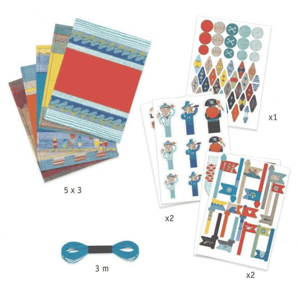 Inhoud Djeco origami knutselset boten op zee met vellen papier stickers en accessoires