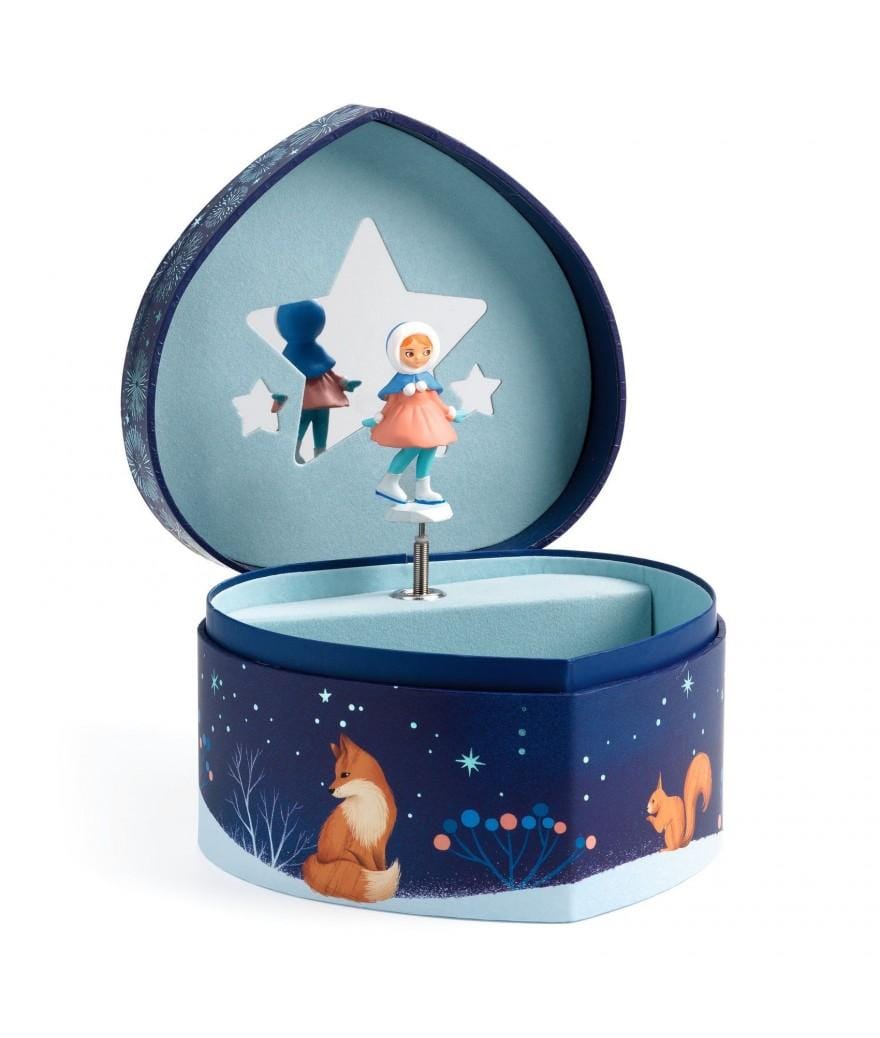 Breng de magie van de winter naar je slaapkamer met dit prachtige Djeco sieraden muziekdoosje met schaatsster. Het hartvormige doosje is afgewerkt met betoverende illustraties en als je het opent, draait een elegante schaatsster rond op de betoverende melodie 'Let me call you sweetheart'. Een perfecte plek om je kostbaarste sieraden te bewaren en een heerlijk winters tintje aan je kamer te geven.