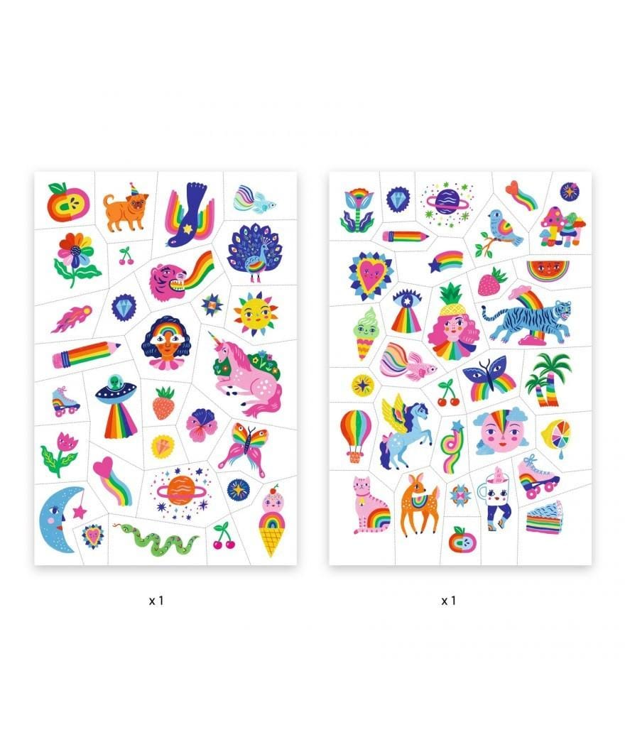 Kleurrijk, vrolijk en vol positieve vibes – de Djeco Tattoos – Rainbow zijn een feestje om te dragen! Deze set bevat twee vellen tijdelijke tattoos met regenbogen, sterren, wolkjes en andere magische elementen in zachte, stralende kleuren. Perfect voor kinderen die houden van kleur en fantasie. De tattoos zijn makkelijk aan te brengen met water, blijven enkele dagen zitten en zijn uiteraard dermatologisch getest. Leuk voor een feestje, als traktatie of gewoon omdat het kan.