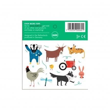 Kakelvers van de boerderij! De Makii Tattoos – Boerderijdieren brengen het platteland tot leven met meer dan 10 tijdelijke tattoos van vrolijke dieren. Denk aan koeien, kippen, varkens en schapen – allemaal kleurrijk geïllustreerd in de kenmerkende stijl van Makii. De tattoos zijn makkelijk aan te brengen met water, blijven een paar dagen zitten en zijn dermatologisch getest. Ideaal voor kleine dierenvrienden, kinderfeestjes of als speels cadeautje.