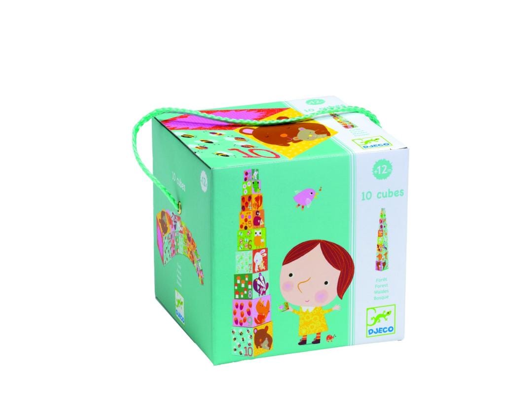• Inhoud: 10 stapelblokken bedrukt met educatieve plaatjes aansprekend voor kleine kinderen met dieren uit het bos, getallen en vormen.