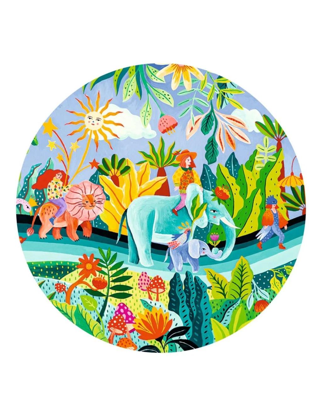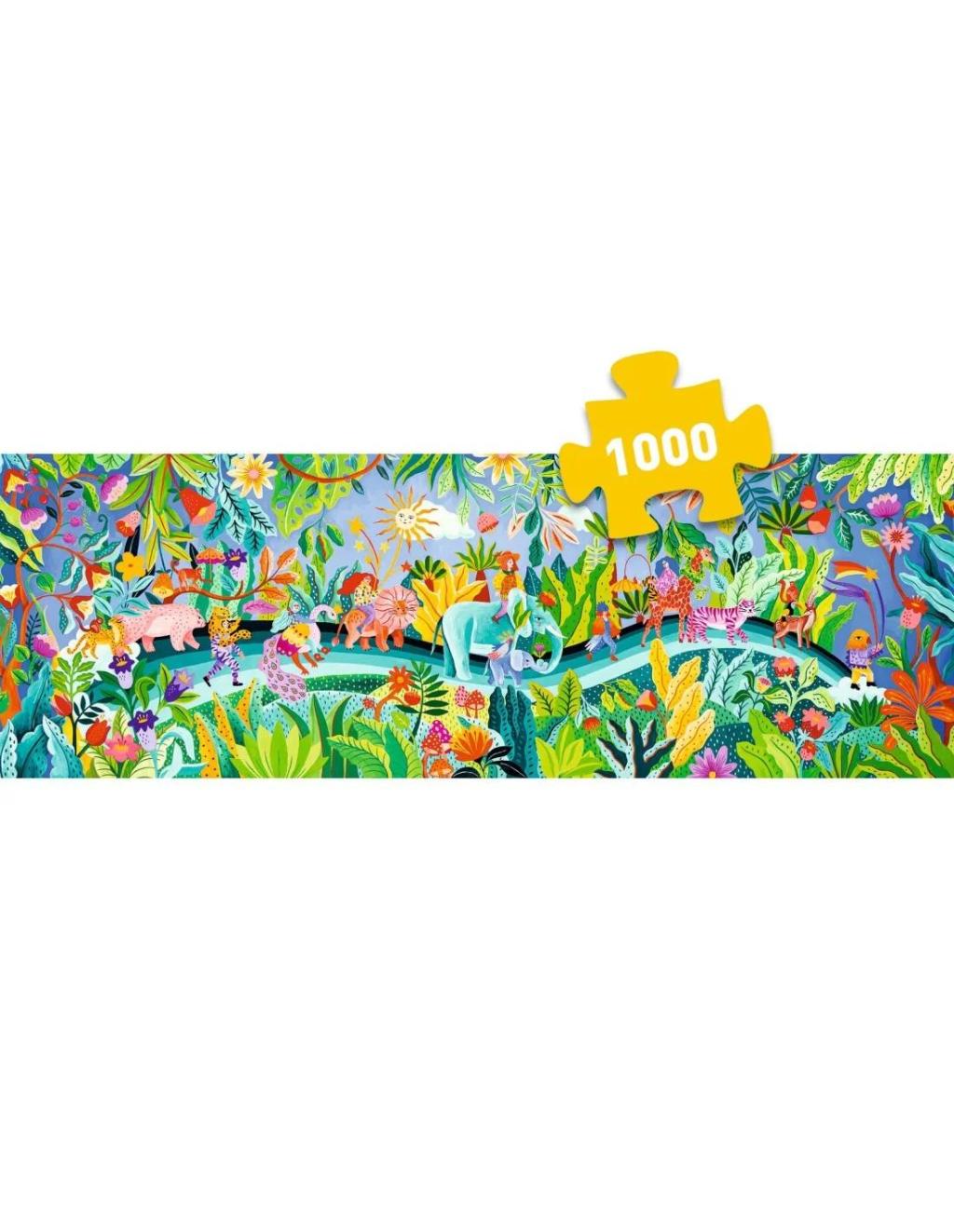 De Djeco puzzel La Fiesta uit de Puzzle Gallery-serie is een kleurrijke panorama puzzel vol fantasie en beweging. In een weelderige jungle trekt een vrolijke optocht voorbij: dieren, muzikanten en feestvierders lopen samen door een landschap vol bloemen, bladeren en exotische planten.