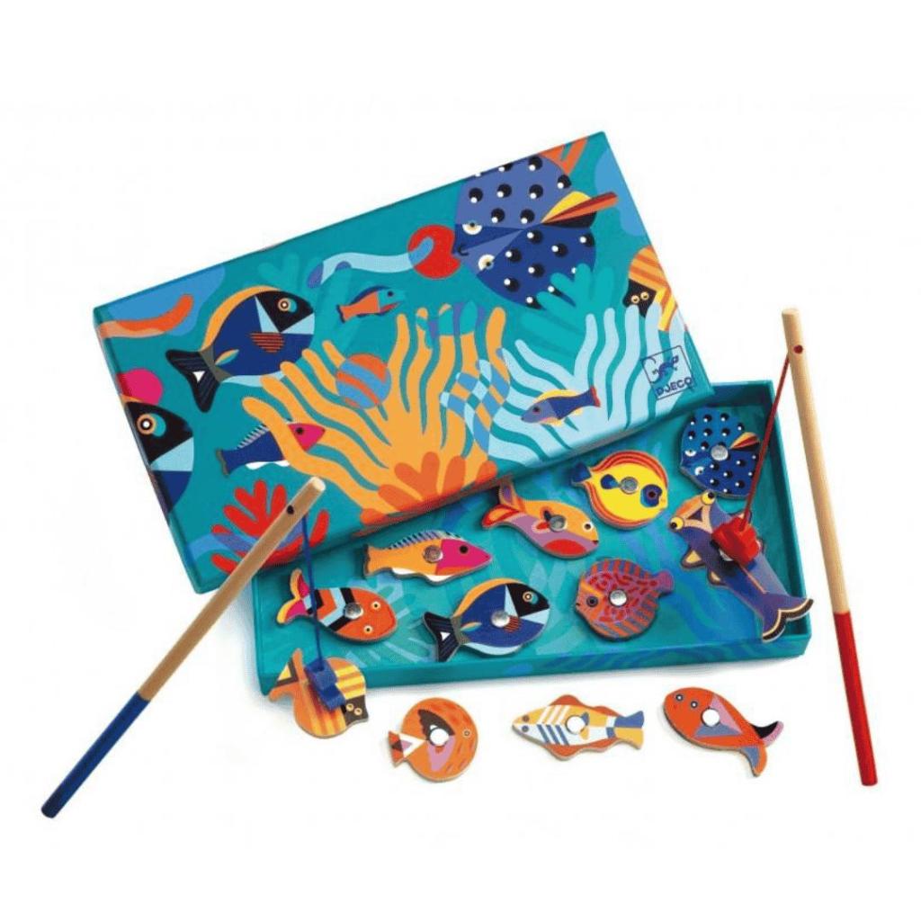 Met het Djeco magnetisch visspel gaan kinderen op een vrolijke visvangst onder water. Met de twee hengels proberen spelers de kleurrijke vissen en schelpen uit de doos te vissen. Dankzij de magneten aan de hengels blijven de houten figuren gemakkelijk hangen.