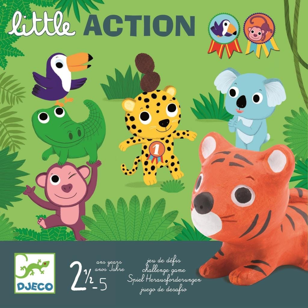 Hoera, het is feest in de jungle! Alle dieren doen mee, kies uit 1 van de 20 actiekaarten en laat de dieren dansen, klimmen of vliegen. Heb jij er een spetterend feestje van gemaakt? Dan verdien je een echte dieren medaille. Little Action is een prachtig spel, speciaal ontworpen voor de allerkleinsten. Simpele maar vrolijke opdrachten die behendigheid en de fijne motoriek stimuleren.