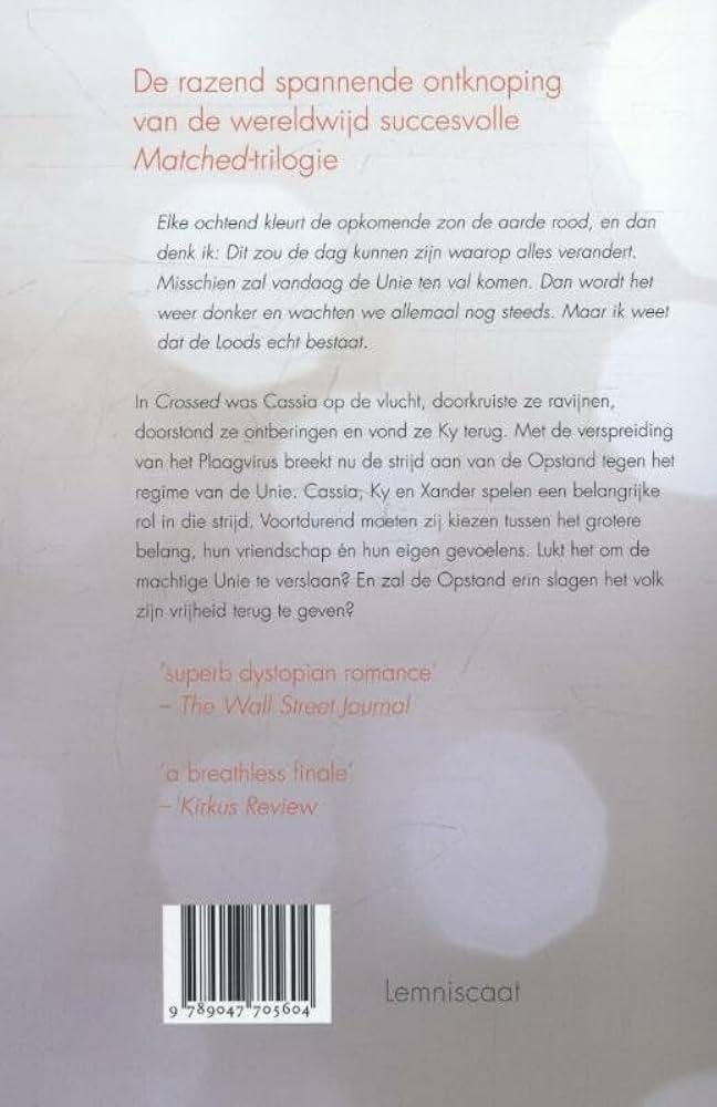 Drie stemmen - die van Cassia, Ky en Xander - vertellen in een wervelwind van verwikkelingen het laatste deel van hun strijd tegen de Unie. We lieten Cassia achter in Crossed nadat ze op haar vlucht ravijnen had doorkruist, ontberingen had doorstaan en Ky had teruggevonden, op het moment dat ze klaarstond om de confrontatie met de Unie aan te gaan. Ze hoeft dat niet alleen te doen: haar beide liefdes, Ky én Xander, staan aan haar kant. Maar is dat genoeg om de machtige Unie aan te kunnen? Om een heel volk zijn keuzevrijheid terug te geven? En dan staat Cassia ook nog voor de moeilijkste keuze: Ky of Xander?