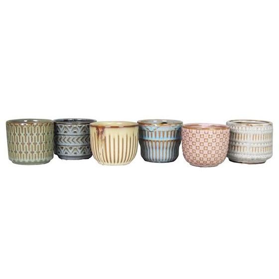 Superleuke kleine potjes voor cactussen of andere miniplantjes. De set bestaat uit 6 verschillende kleuren en motieven. Bij ons kan je ze los bestellen, dus je kan kiezen welke kleur het beste matched bij jouw interieur. Ook leuk om meerdere planten en potten bij elkaar te zetten. Mix en match met de andere bloempotten uit ons assortimen. Deze kleine keramische potten zijn 6cm. hoog en Ø 7,5cm.