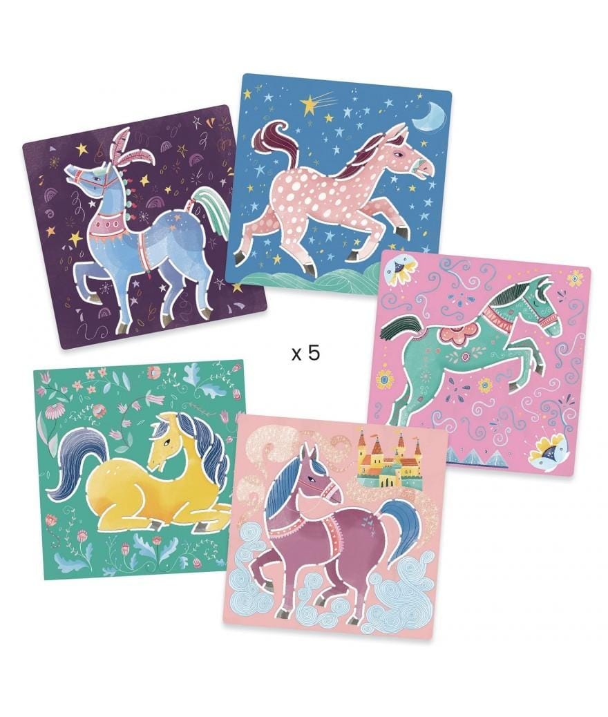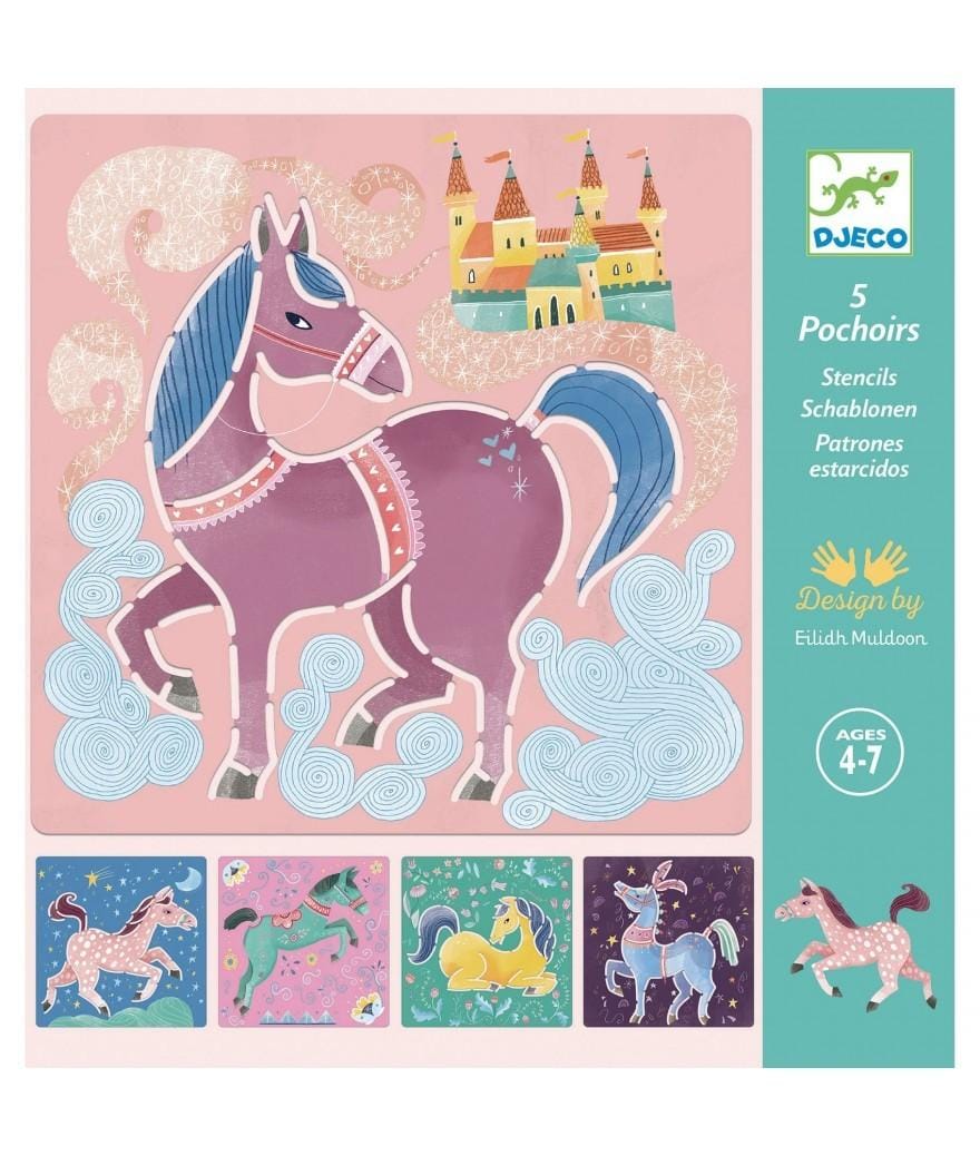 Voor kleine paardenliefhebbers die graag tekenen! Met het Djeco Knutselpakket – Sjablonen Paarden leren kinderen stap voor stap hoe ze paarden kunnen natekenen. De set bevat 5 stevige kunststof sjablonen met verschillende paardenscènes en -houdingen.