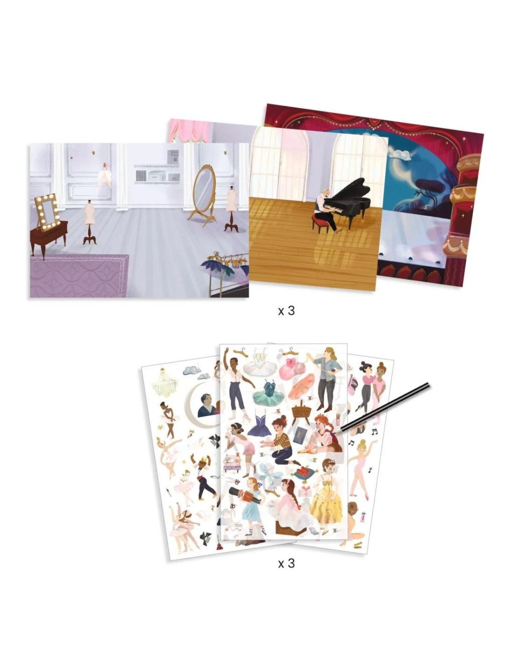 Kinderen kiezen één van de drie grote geïllustreerde achtergronden – een balletstudio, een repetitieruimte of een podium in de opera – en bepalen zelf waar de dansers komen te staan. Door met een potlood over de sticker te wrijven wordt de afbeelding overgebracht op het decor.