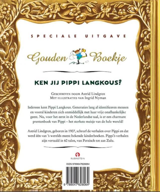Iedereen kent Pippi Langkous – het sterkste meisje van de wereld met twee eigenwijze vlechten en een hart van goud. In dit luxe Gouden Boekje maak je op speelse wijze kennis met Pippi, haar avonturen en haar vrije, eigenzinnige kijk op het leven. Geschreven door Astrid Lindgren en met illustraties van Ingrid Nyman, verschijnt dit boekje nu voor het eerst in het Nederlands in deze bijzondere vorm. Een charmant prentenboek dat kinderen én volwassenen raakt – met een vrolijke boodschap over kracht, onafhankelijkheid en durven zijn wie je bent. De opbrengst van dit boekje ondersteunt Save the Children, dus je geeft niet alleen een mooi cadeau, maar draagt ook bij aan een betere wereld.