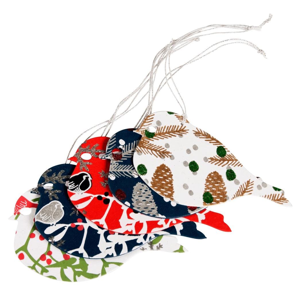 Prachtige gedecoreerde papieren goudvinken om op een simpele manier je huis in kerstsfeer te brengen. Het dikke, grove papier is in verschillende kleuren geverfd en vervolgens met een kerstprint in zilver en goud bedrukt. Iedere verpakking bevat 5 goudvinken. Een prachtig Scancinavisch design van Pluto.