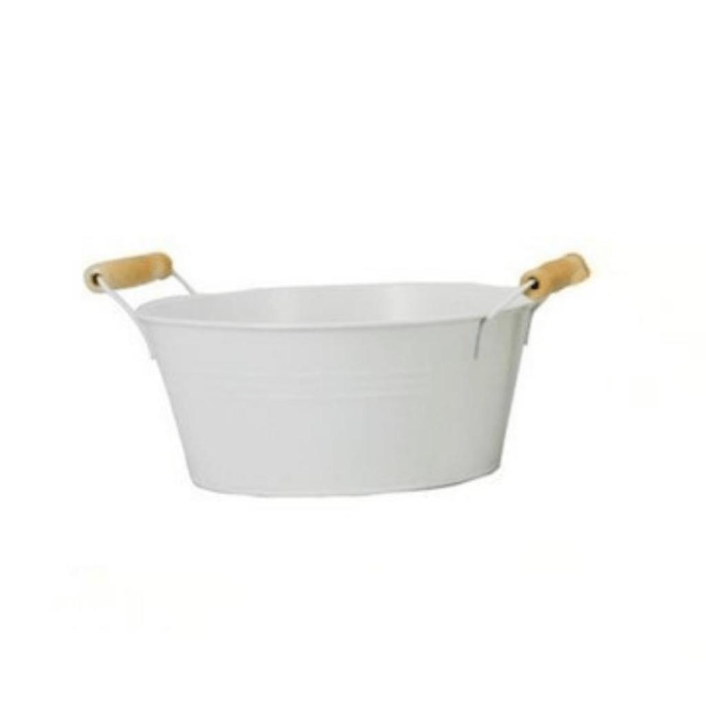 Schaal Badia Wit – Zinken plantenbak met houten handgrepen (D19 × H8,5 cm)