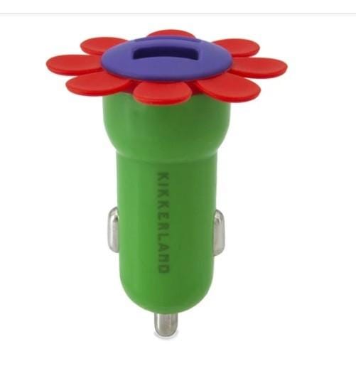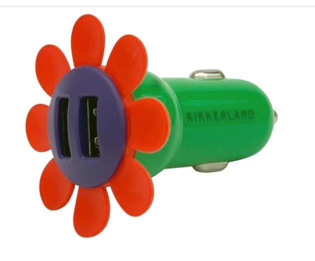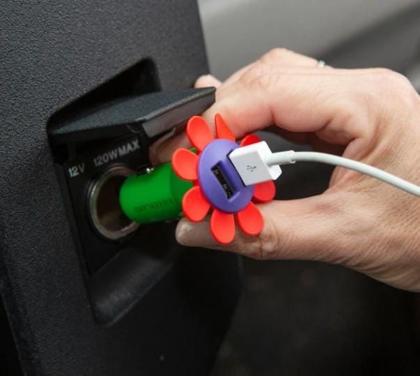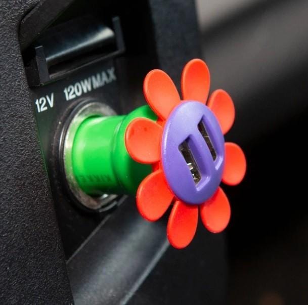 Een hippe oplaadpoort voor in de auto. Deze vrolijke, kleurrijke Bloem Oplader laadt 2 USB-apparaten tegelijk op. Handig voor op vakantie, of als je thuis vergeten bent om je telefoon op te laden en nu écht weg moet.