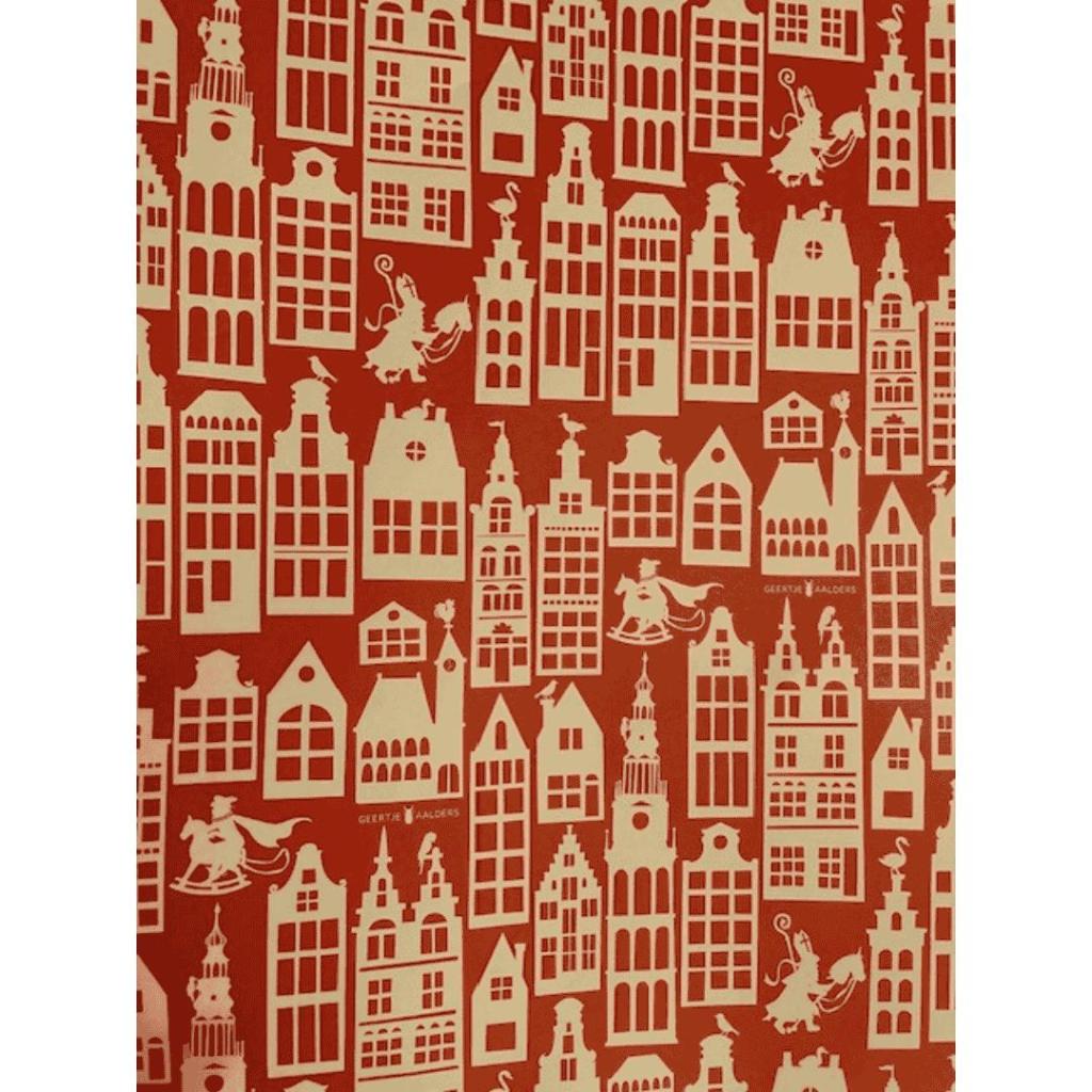 Dit Sinterklaas inpakpapier is ideaal voor het feestelijke inpakken van cadeautjes. Het papier heeft een vrolijk patroon met nostalgische grachtenpandjes en speelse Sinterklaasillustraties, in een warme rood-witkleurige stijl.