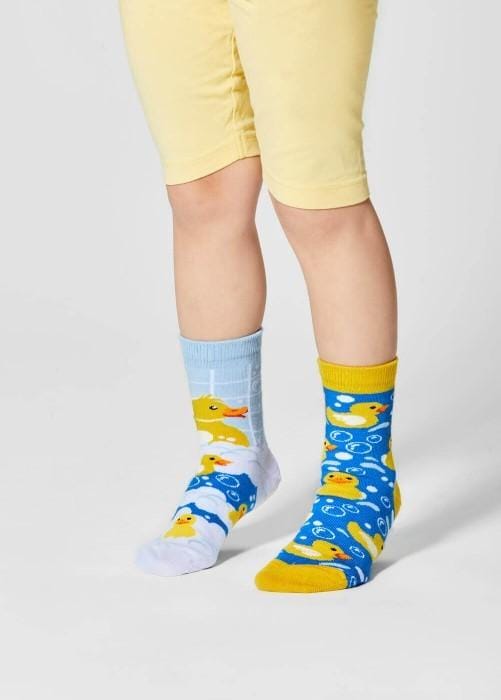 Twee unieke sokken die samen een paar vormen. De ene sok is blauw met gele eendjes, de andere sok is wit met blauw en gele eendjes. Wedden dat je kind ze niet uit wil trekken?