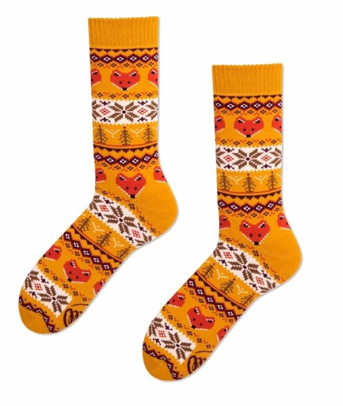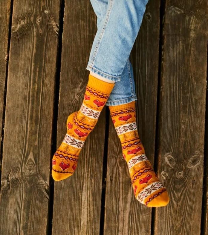 Many Mornings heeft nu ook lekkere dikke, warme kerstsokken, thuis voor op de bank. Deze Warm Fox sokken hebben een mooie okergele kleur waarin een traditioneel patroon met de snuit van een rode vos in is verwerkt.