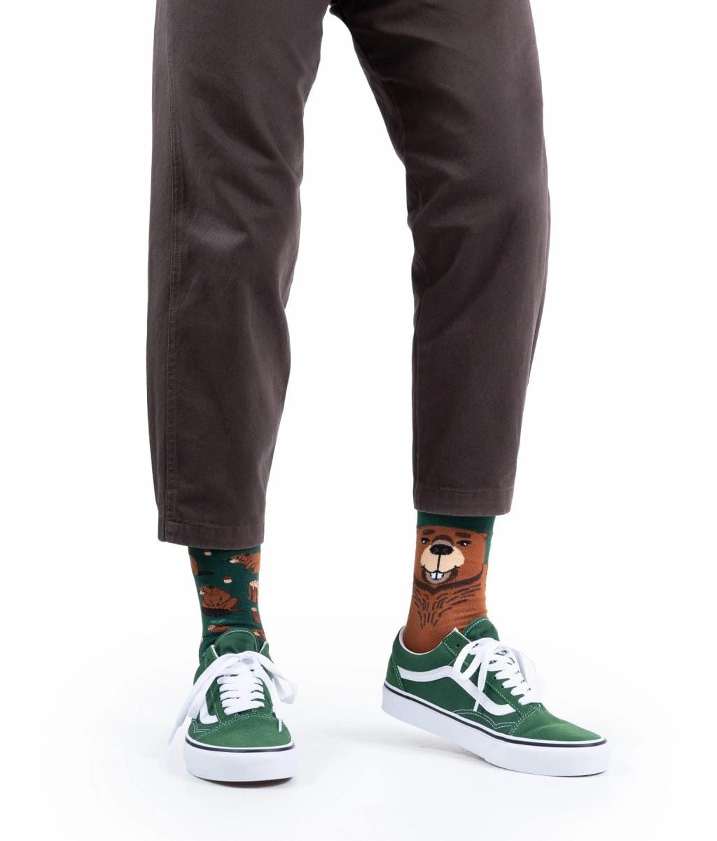 De Beaverly Heels sokken in maat 39–42 combineren humor, natuur en comfort in één verrassend paar. Eén sok zit vol druk knagende bevers en boomstammetjes, terwijl de andere een trotse bever toont met zijn karakteristieke staart op de zool.