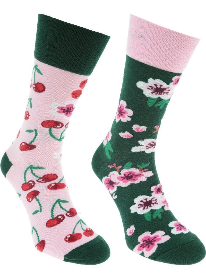 Met deze vrolijke sokken zie je op de ene sok de prachtige kersenbloesem zoals we die in de lente zien, en op de andere sok de vruchten die vervolgens in de nazomer aan de bomen groeien. Een superleuk paar MisMatch sokken van het Poolse Many Mornings. Alle katoenen sokken zijn verkrijgbaar in 3 maten voor de schoenmaten 35 t/m 46.