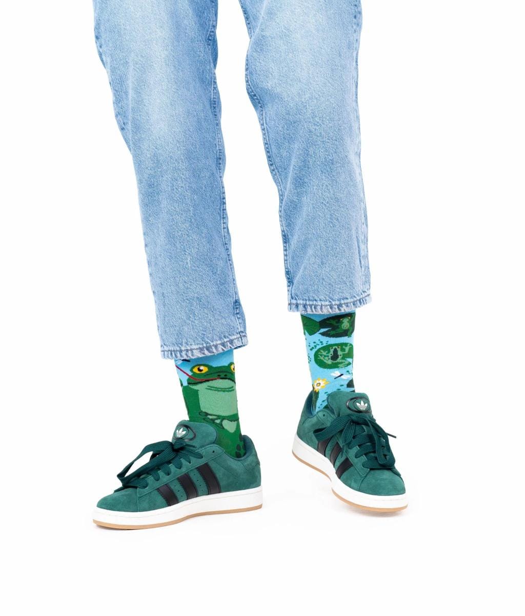 Voor wie van frisse kleuren en grappige dieren houdt: de Froggy Frog sokken van Many Mornings in maat 39–42 zijn een feestje om te dragen. Van het wateroppervlak met kikkers tot een grote glimlachende kikker met een libel op z’n tong – deze sokken zorgen gegarandeerd voor een glimlach.