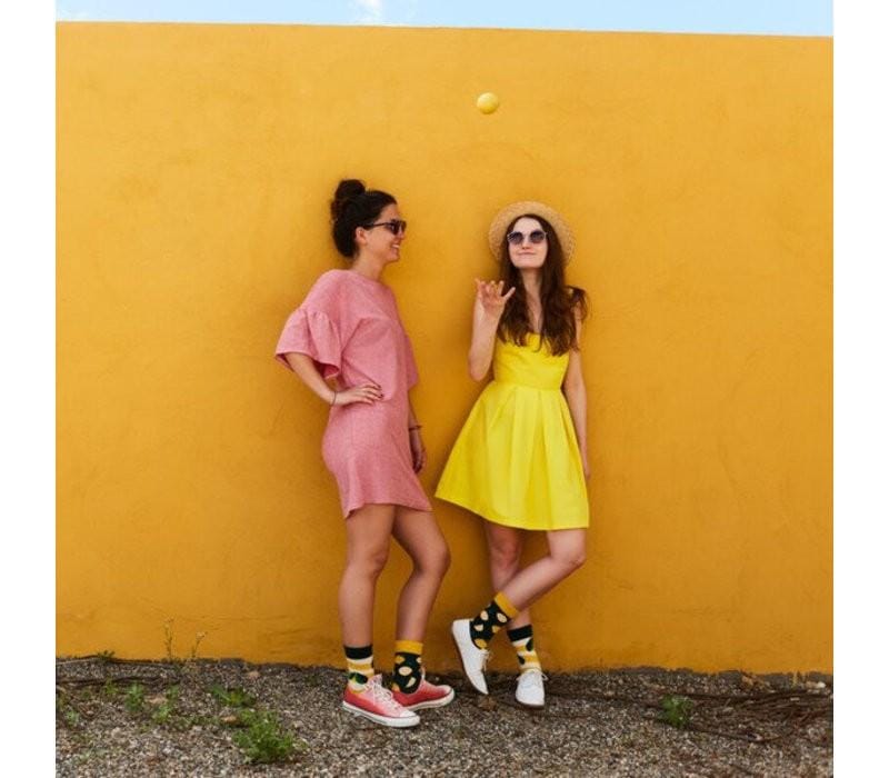 Vrolijke sokken van Many Mornings, The Lemon. Twee verschillende sokken in hetzelfde zomerse citroen thema. De sokken zijn verkrijgbaar in 3 maten voor schoenmaat 35 t/m 46. Ze zijn gemaakt van hoogwaardige katoen en polyamide. Toffe sokken waarmee jij jezelf kan onderscheiden.