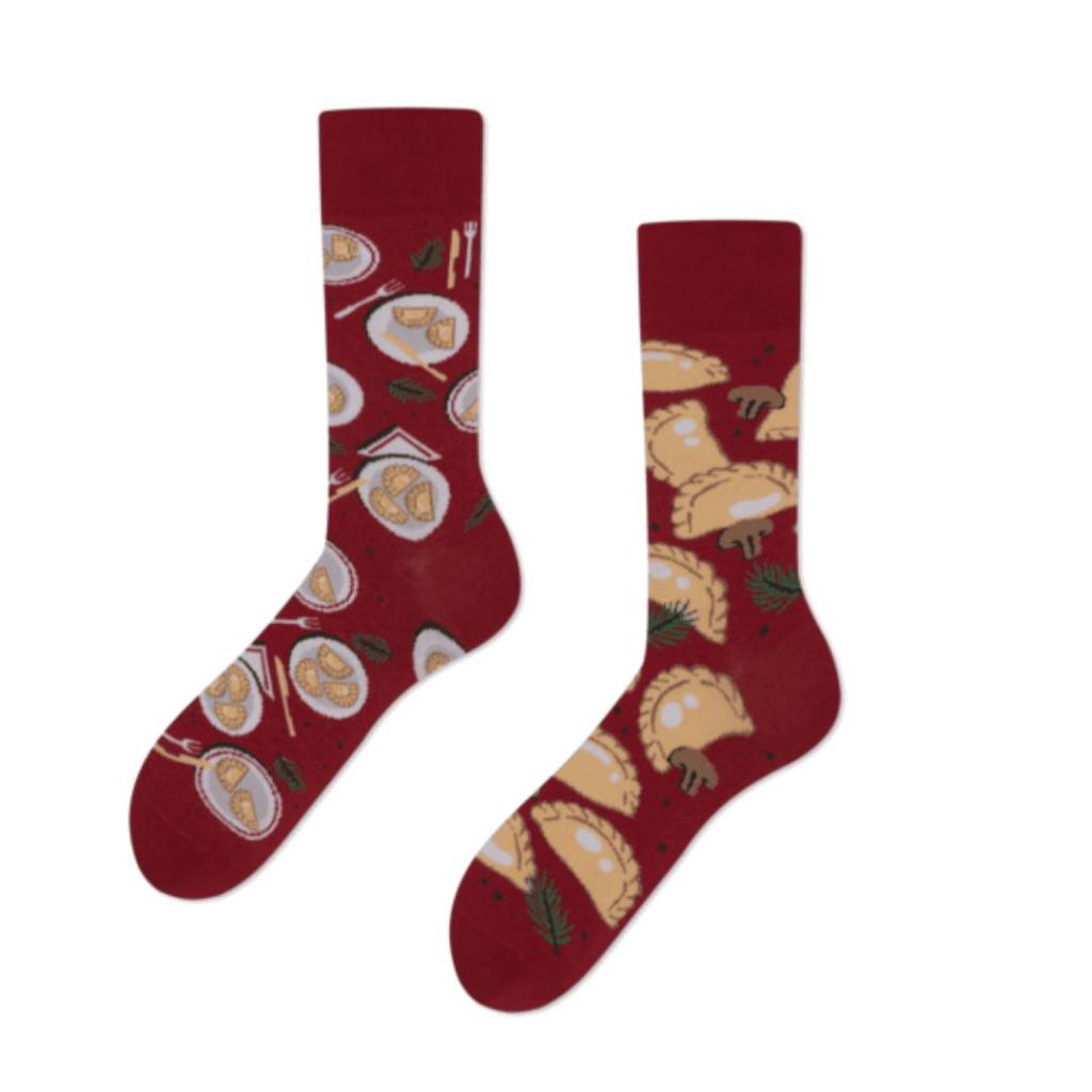 Voor de kleine fijnproevers onder ons: de Many Mornings MisMatch Sokken – The Pierogies zijn een eerbetoon aan de Poolse keuken. Deze warme rode sokken tonen op de ene sok een bord met dampende pierogi’s, op de andere de heerlijke deegpakketjes zelf. Perfect voor iedereen die comfort wil met een knipoog naar culinaire gezelligheid. Gemaakt van zacht katoen en een beetje stretch voor een fijne pasvorm. Twee sokken die nét niet hetzelfde zijn – maar juist daardoor een perfect paar vormen.