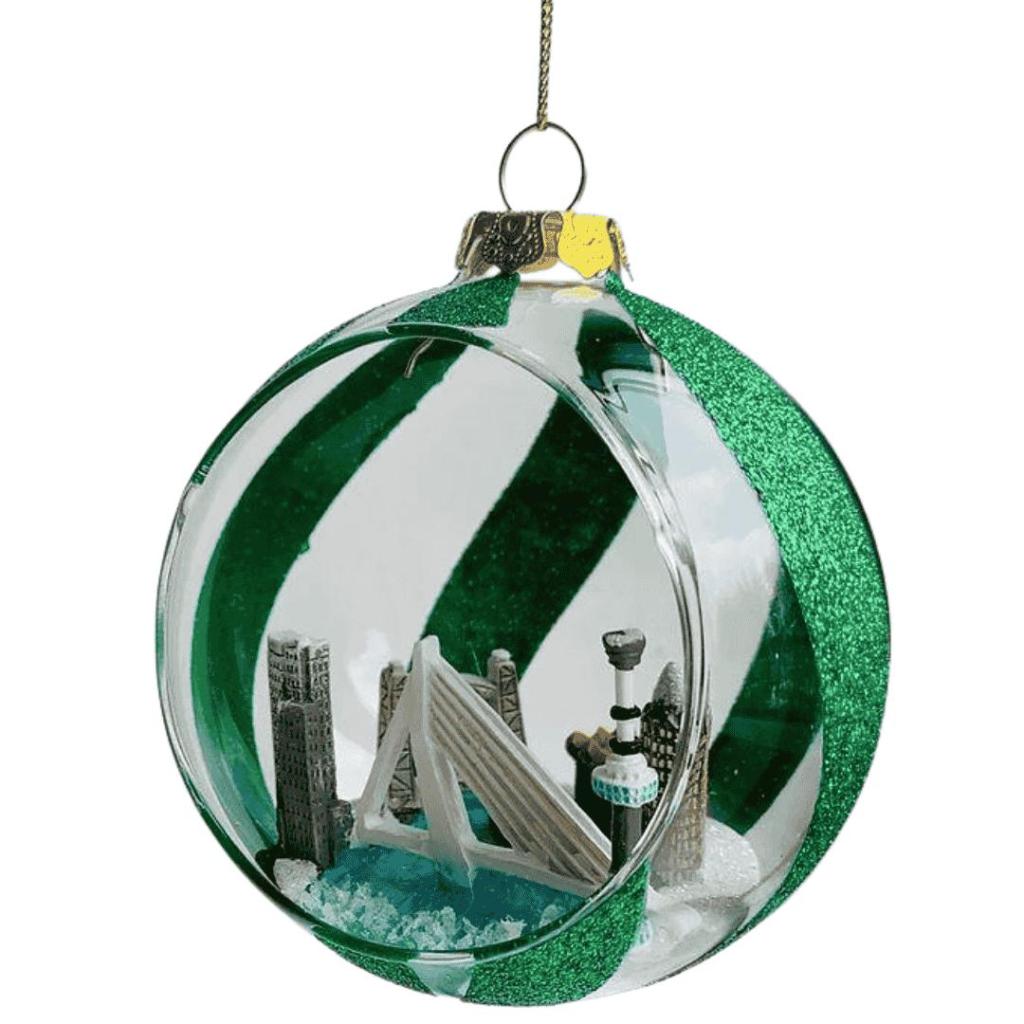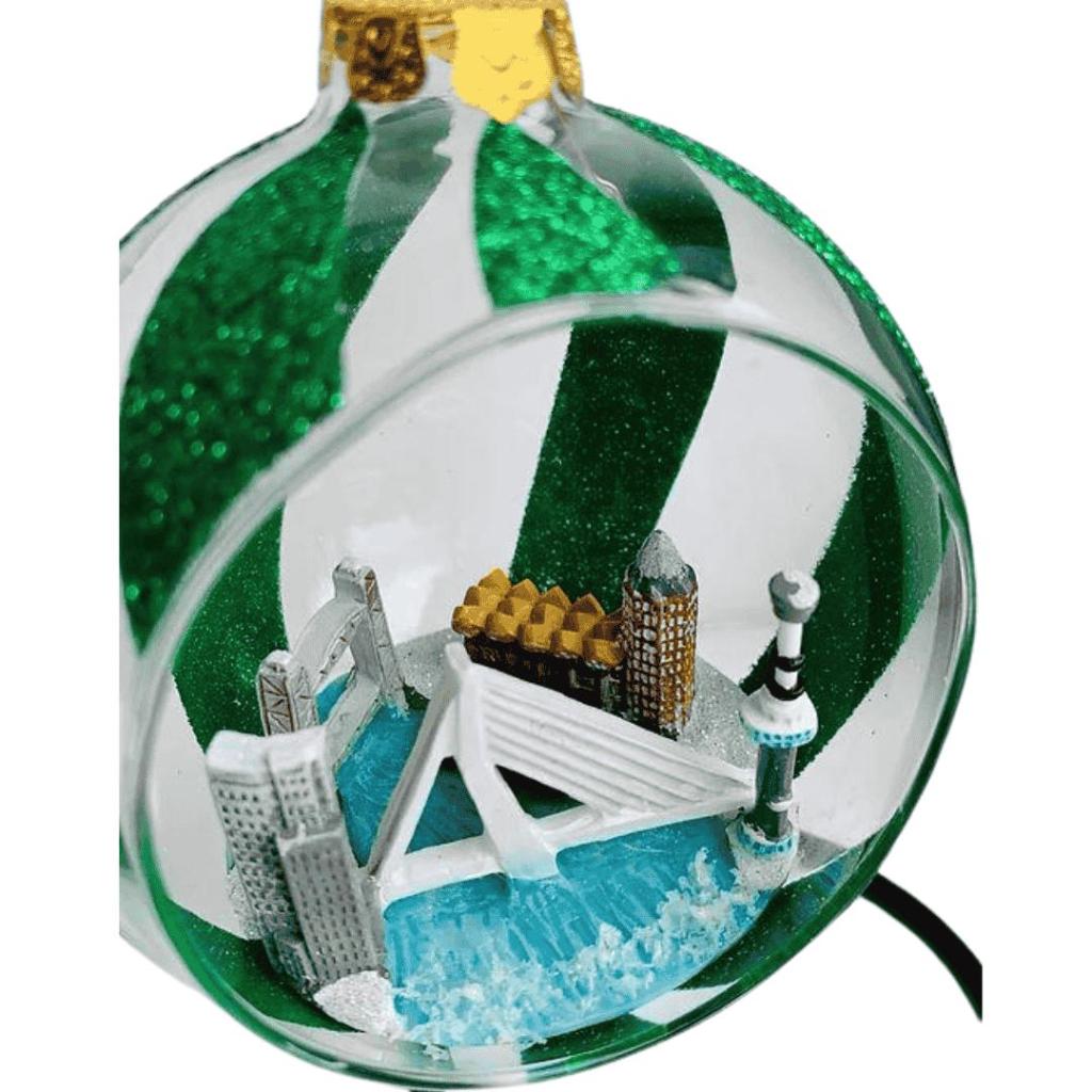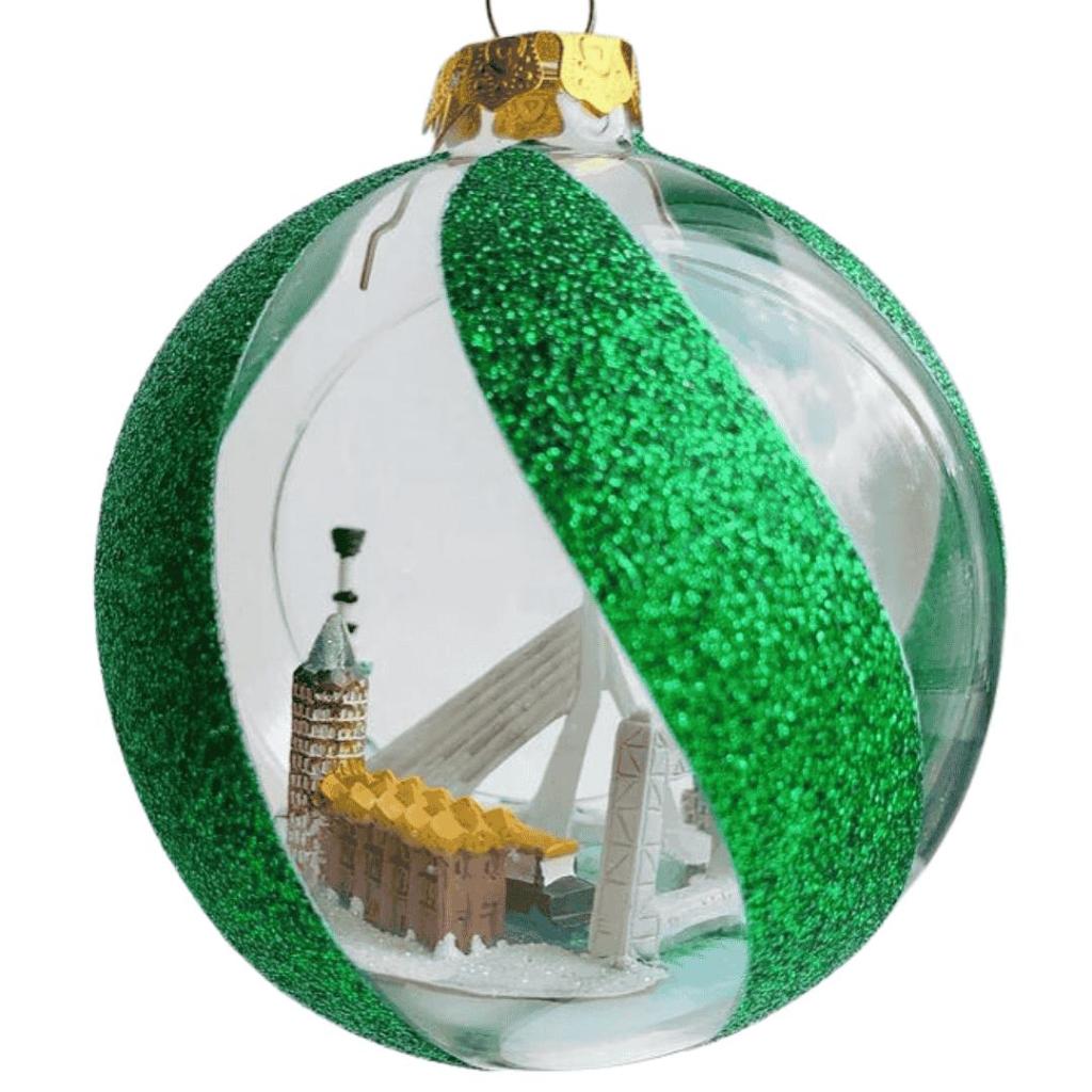 Breng de moderne skyline van Rotterdam in je kerstboom met deze bijzondere glazen open bal. Het ornament is versierd met groene glitterbanen en onthult een miniatuurweergave van iconische bezienswaardigheden: de Erasmusbrug, de Kubuswoningen, De Hef, de Blaaktoren en de Euromast. Het open design zorgt ervoor dat de stadse details prachtig zichtbaar zijn, terwijl de glitters een feestelijke uitstraling geven. Een uniek kerstornament voor echte Rotterdammers of als cadeau voor liefhebbers van de stad.