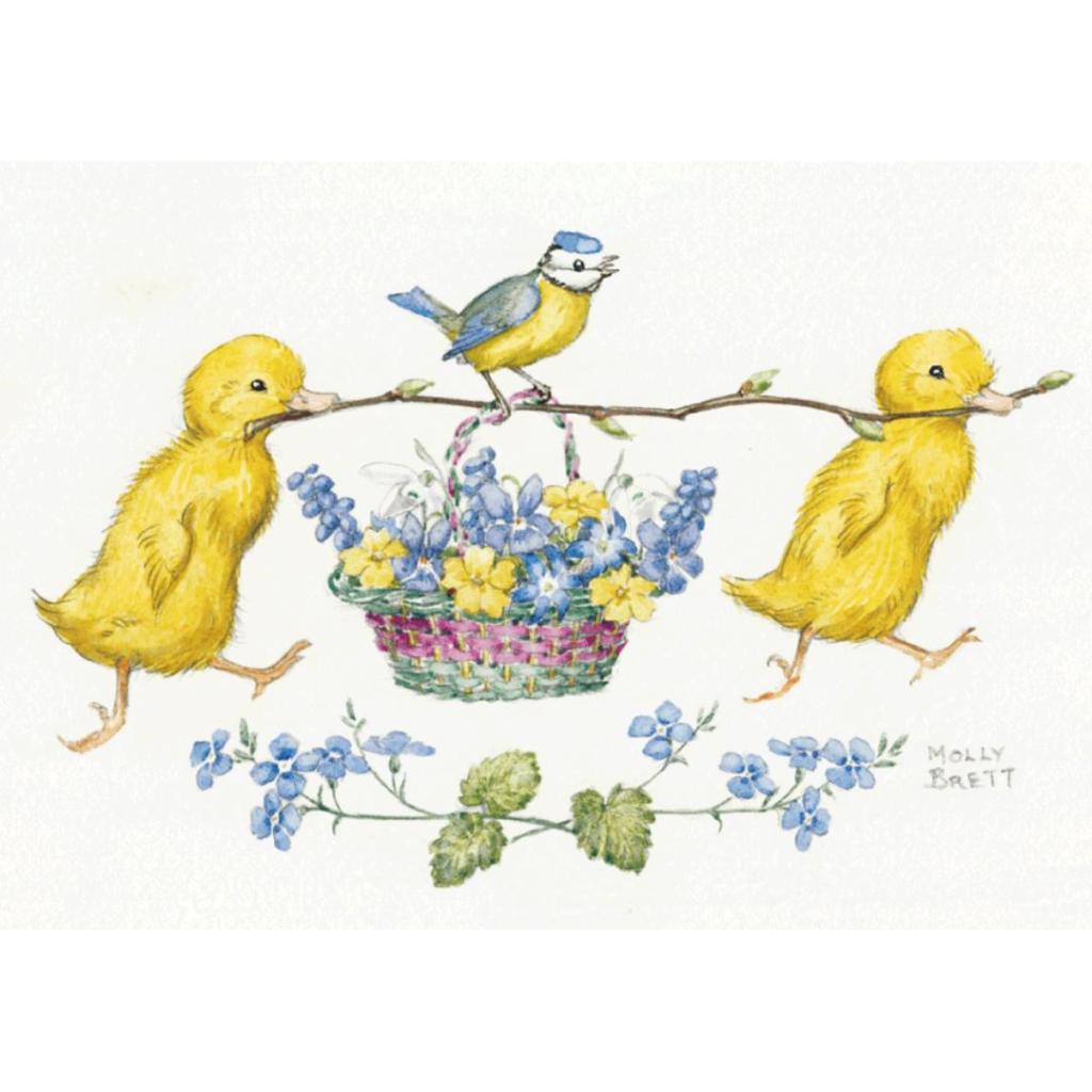 Deze vrolijke ansichtkaart van Molly Brett toont twee schattige eendjes die samen een tak dragen, met in het midden een mandje vol bloemen waar een koolmeesje op zit. De zachte kleuren en speelse compositie geven de illustratie een lichte en opgewekte uitstraling.