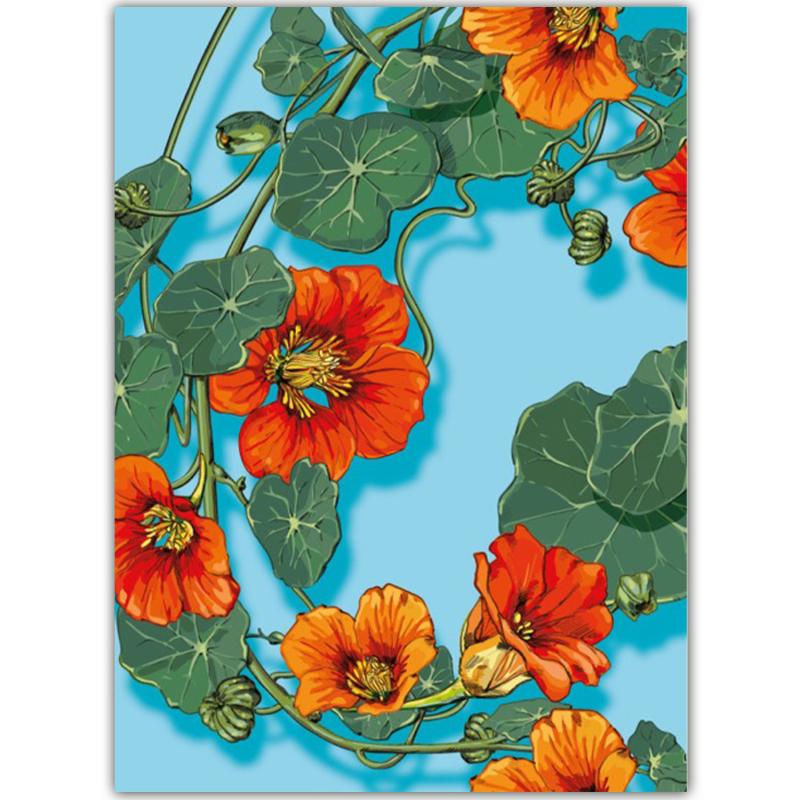 Ansichtkaart Mine laat een speelse bloemenkrans van oost-Indische kers zien, met haar herkenbare ronde bladeren en warme oranje bloemen tegen een frisse blauwe achtergrond. De rankende stelen en open compositie geven de kaart een luchtige, zomerse uitstraling. Een kaart die zowel vrolijk als stijlvol is en geschikt voor allerlei momenten: een felicitatie, bedankje of zomaar een groet.