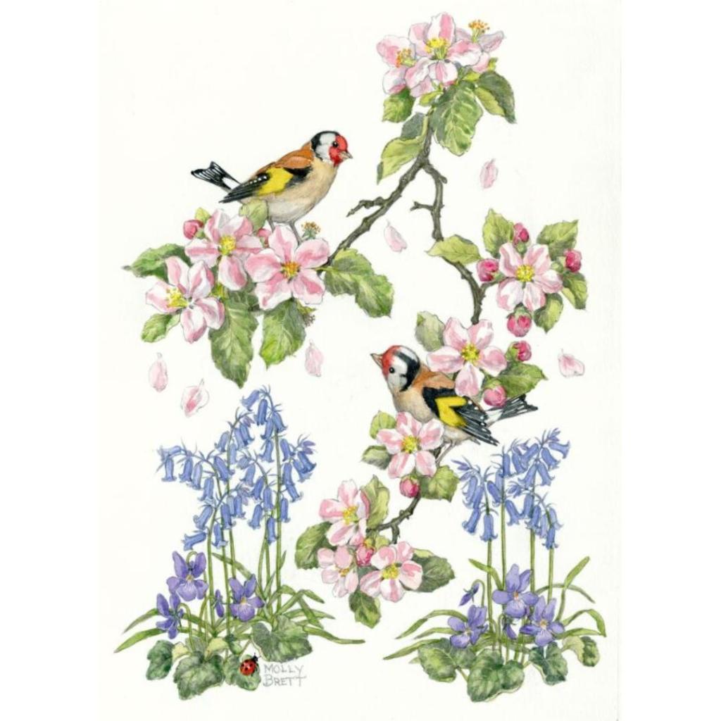 Deze elegante ansichtkaart van Molly Brett toont twee puttertjes tussen bloesemtakken, omringd door blauwe boshyacinten en viooltjes. De zachte kleuren en fijne details geven de illustratie een rustige en romantische uitstraling.