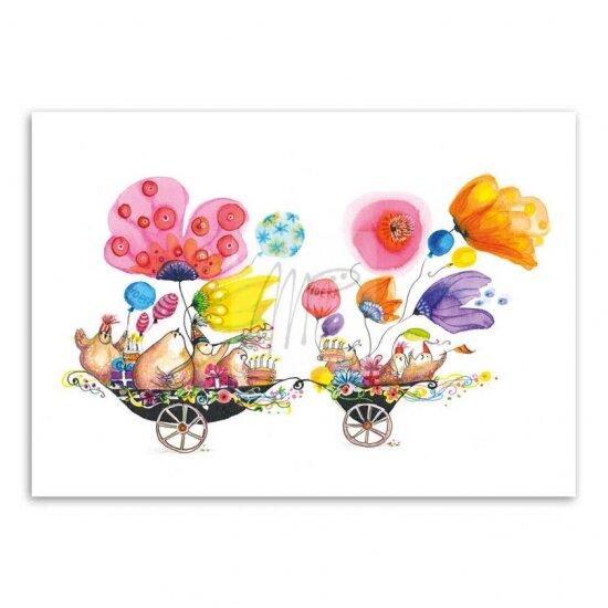 Een feestelijke kaart vol kleur en vrolijkheid! Twee karretjes gevuld met bloemen, ballonnen en cadeautjes maken deze illustratie perfect voor een sprankelende verjaardagswens.