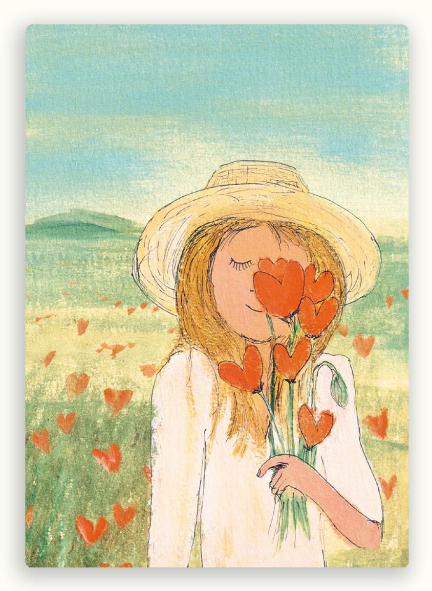 Een dromerig tafereel: een meisje met strohoed ruikt gelukzalig aan een bos hartvormige bloemen, omringd door een veld vol liefdevolle hartjes. Een warme en zachte illustratie die perfect is voor een lieve groet, dankjewel of zomaar.