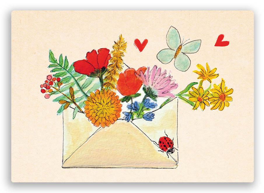 Bloemen per post – daar wordt iedereen blij van! De Zintenz kaart ‘Bloemenpost’ brengt een kleurrijk boeket rechtstreeks in de brievenbus. Ideaal om iemand op te fleuren, te bedanken of gewoon zomaar een beetje liefde te sturen. De bloemenillustratie straalt vrolijkheid uit, en zoals altijd is de kaart gedrukt op gerecycled landbouwafvalpapier met milieuvriendelijke inkt. Duurzaam, fleurig en met een hartelijke boodschap.