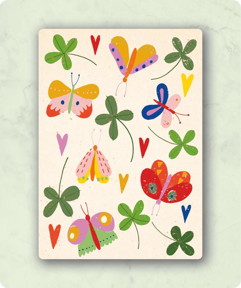 De "Klavertjes en Vlinders" postkaart van Zintenz is een frisse, natuurinspirerende kaart die de kracht van geluk en verandering symboliseert. Het ontwerp met klavertjes en vlinders brengt een boodschap van hoop, geluk en persoonlijke groei. Gedrukt op 100% gerecycled papier, is deze kaart een prachtig en duurzaam gebaar om iemand een positieve boost te geven of om simpelweg te laten weten dat je aan ze denkt.