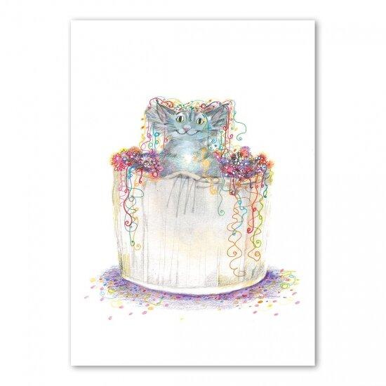 Een nieuwsgierige kat piept uit een doos vol slingers en bloemen, klaar om je te verrassen! Deze kaart straalt speelsheid en vrolijkheid uit – perfect voor verjaardagen en feestelijke momenten.