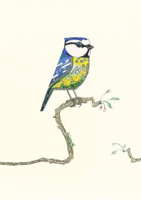 Een pimpelmees met een vleugje magie! Dit kleine vogeltje zit fier op zijn tak, versierd met sierlijke patronen en heldere kleuren. Een kaart die natuur en kunst prachtig samenbrengt. Perfect om een vrolijke noot te sturen of als klein kunstwerkje voor jezelf.