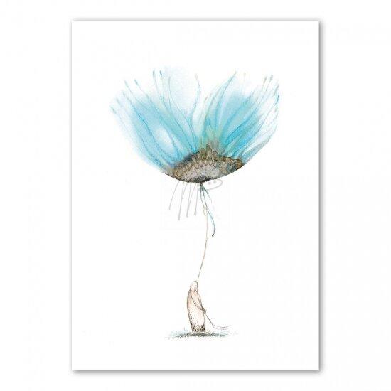 Een liefdevolle illustratie waarin kleine vogels geborgen zitten onder een kleurrijke bloemenparaplu. Een tedere kaart voor een speciale boodschap van liefde of troost.