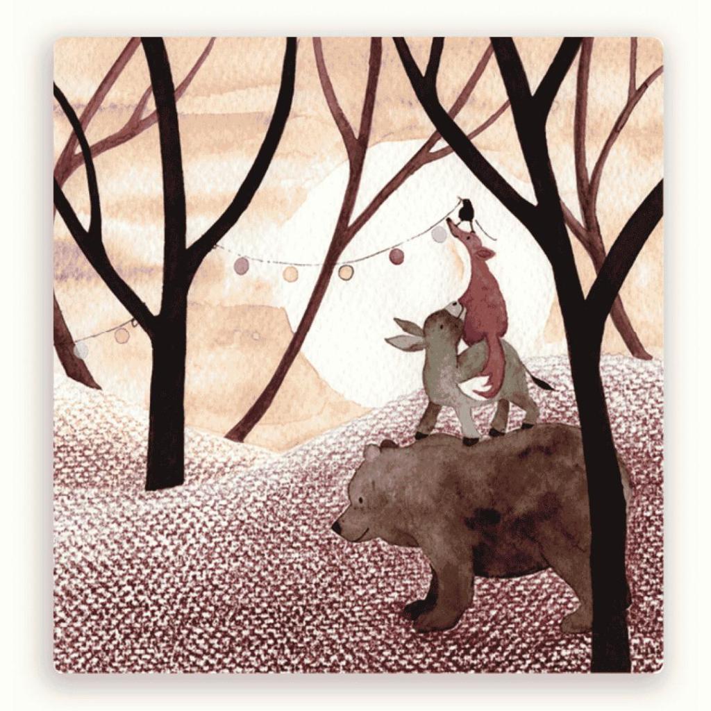 Samen sta je sterker – letterlijk! Op deze warme, dromerige illustratie van ZintenZ helpen een beer, ezel, vos en merel elkaar om lichtjes op te hangen tussen de bomen. De avond valt en de samenwerking straalt rust, vriendschap en gezelligheid uit. Een kaart die perfect is voor donkere dagen, bijzondere momenten of gewoon om iemand een glimlach te bezorgen.