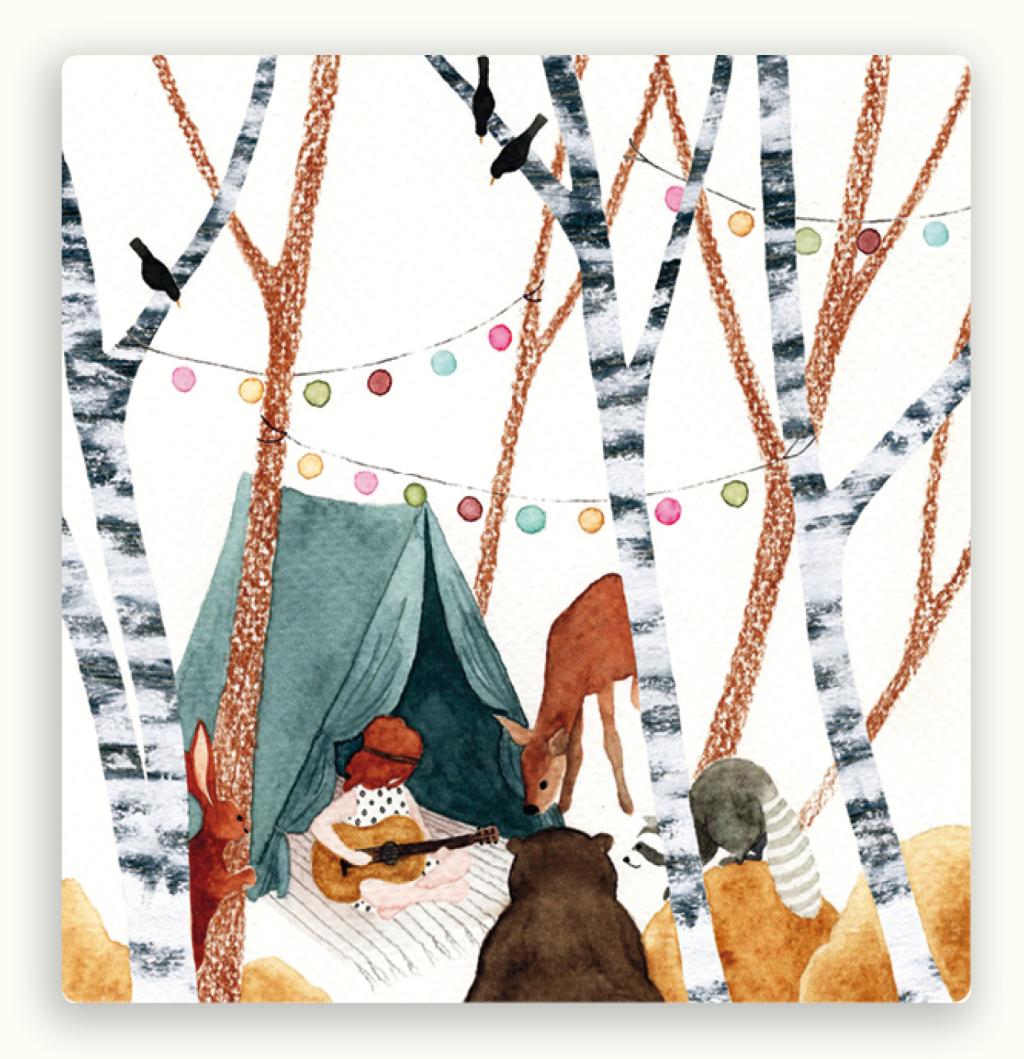 Een knusse kampeeravond in het bos: een meisje speelt gitaar in haar tent, terwijl dieren als een beer, vos, das, hert en eekhoorn nieuwsgierig toekijken. Vrolijke lichtjes hangen tussen de bomen en geven de scene een warme, bijna sprookjesachtige sfeer. Deze vierkante kaart van ZintenZ is perfect voor natuurliefhebbers en dagdromers.