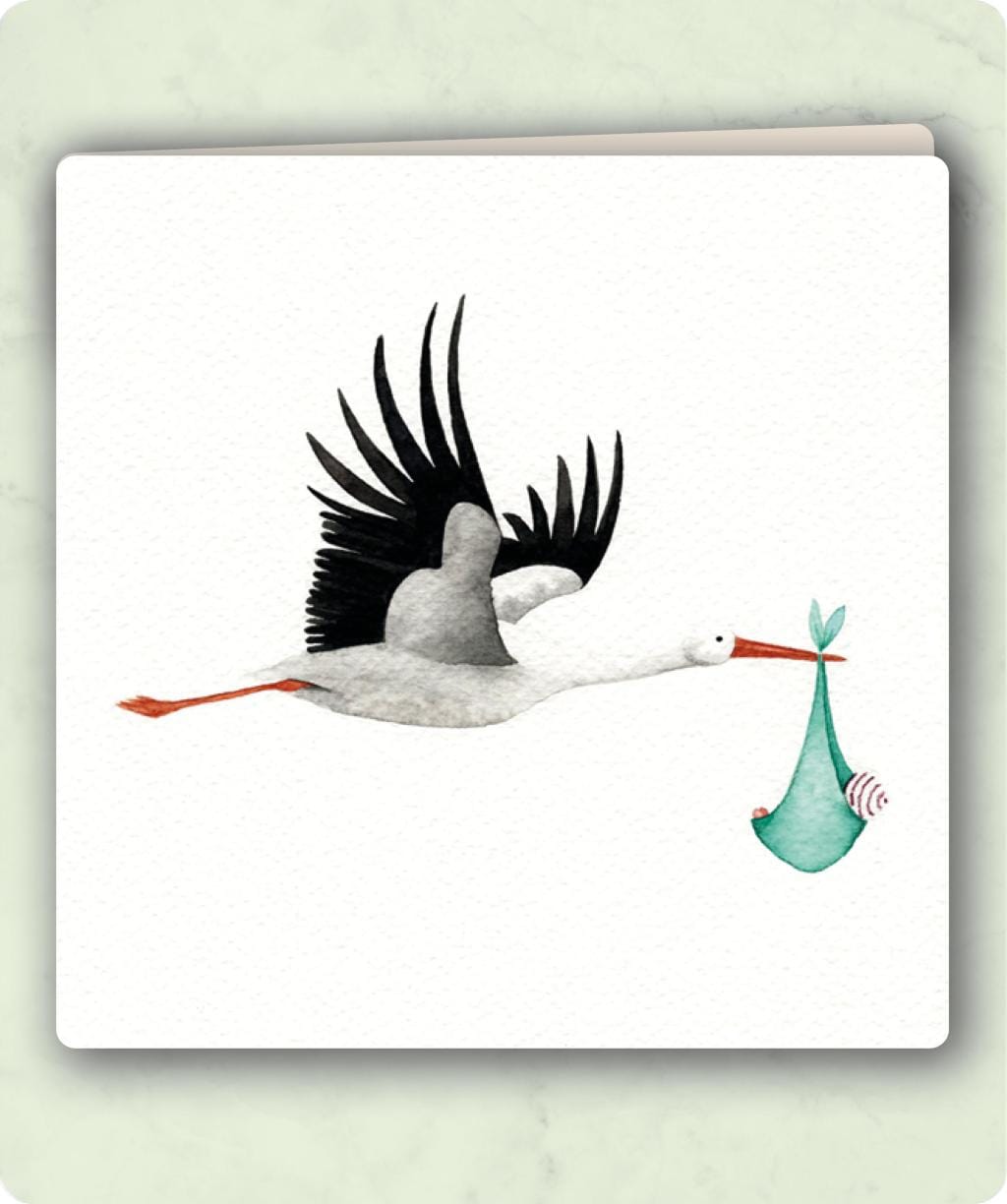 Een sfeervolle en symbolische Zintenz dubbele kaart met een illustratie van een ooievaar die op bezoek komt. De ooievaar staat al eeuwenlang symbool voor nieuw leven en geboorte, waardoor deze kaart perfect is om kersverse ouders te feliciteren of om een zwangerschap aan te kondigen.