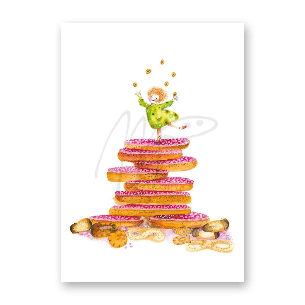 Een speelse stapel beschuiten met roze muisjes en een vrolijk figuurtje dat de muisjes in de lucht gooit. Een feestelijke kaart voor een geboorte of babyshower, vol energie en blijdschap.
