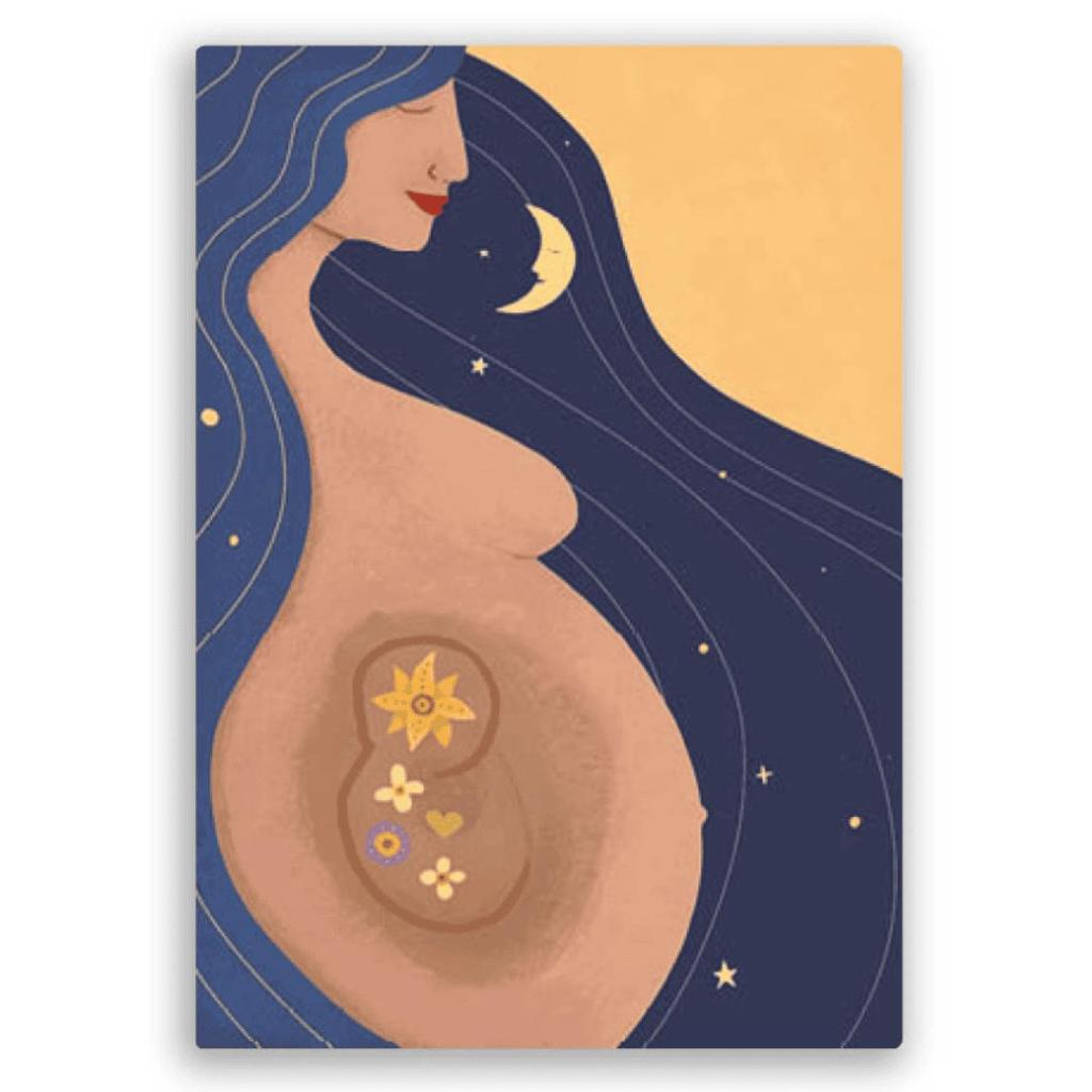 Een warme en bijzondere postkaart met een zwangere vrouw, omringd door maan en sterren. Een tedere illustratie die nieuw leven, groei en verbondenheid symboliseert.
